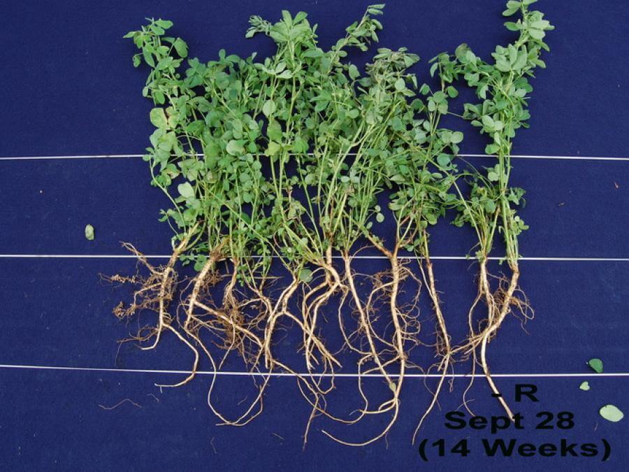 Due to the Rhizobium nitrogen-fixing symbiosis within their own roots, most legume species will, on average, possess higher concentrations of nitrogen that subsequently lead to higher levels of amino acids and protein, than most grasses. However, if this internal, nitrogen-fixing process does not take place because of poor Rhizobium infection or nodulation, then the legume plant must rely on its own root system to extract available soil nitrogen. In a competitive environment, legume root systems are not as efficient as grasses for extracting nutrients, especially in mixed stands. This in turn can result in poorer yields of dry matter and protein of the legume. Therefore, one must do everything to ensure that this Rhizobium symbiosis takes place as quickly and efficiently as possible. The Nitro-Coat® process, which aims at providing the highest possible numbers of live Rhizobium to each seed at the time of planting, is excellent insurance to make sure that happens, especially for valuable high-performance forage legumes.
